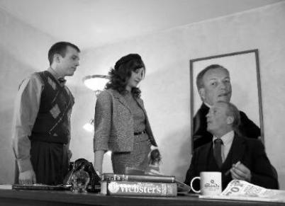 | EVENING MOON STAFFERS JAMIE OLDSTONE AND LOTUS LAMÉ GET A FREE LECTURE ON YELLOW JOURNALISM FROM HEAD HONCHO BARRY BLACK, WHOSE FRONT PAGE STORY TURNED AN INNOCENT ATM WITHDRAWAL INTO A SCANDALOUS BANK ROBBERY. HE ALSO CASUALLY ANNOUNCES HIS HIRING OF NOVICE KENT CLARK AS HEAD REPORTER. |